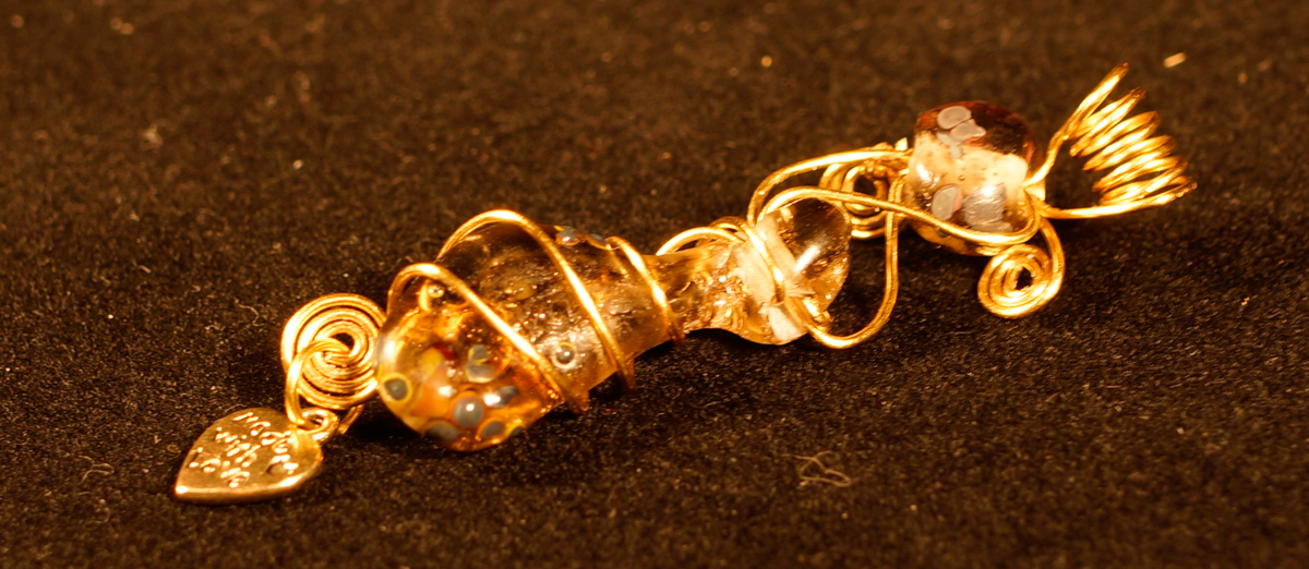 I‘ve always had a fascination with colorful and unique beads for my wire and bead art. I’ve discovered wire wound flamework or “lampworking,” the ancient art of making glass beads. Each bead is handmade one at a time using a gas fueled torch to melt rods of clear and colored glass and wrapping that molten glass around a “mandrel,” a clay coated rod. The base bead is layered with variations of colored flowing glass into interesting and imaginative beads.